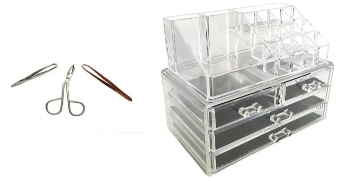 استند لوازم آرایشی شفاف به همراه ست موچین