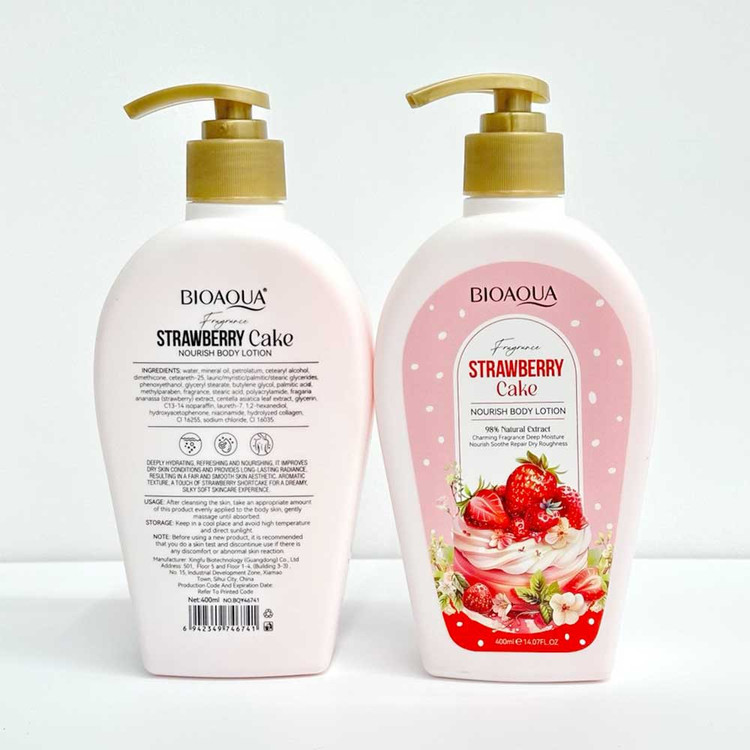 لوسیون بدن رایحه کیک توت فرنگی حجم 400 میلی لیتر برند بیو آکوا