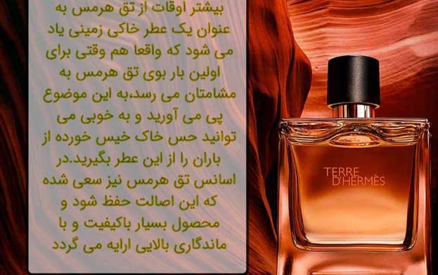 عطر ادکلن هرمس تق هرمس-Hermes Terre d’Hermes، با رایحه ای تند و تلخ ، همچنین سبکی چوبی روانه ی بازار شد . این عطر بهترین انتخاب برای فصل بهار و پاییز می باشد . تق د هرمس برای آقایان مدرن و شهری به منظور خلاصی از شلوغی و ازدحام شهری ساخته شده است. این عطر از خانوادهی بویایی سرخسها بوده و اگر طرفدار بوی چوب هستید د هرمس گزینهای است که بهراحتی نمیتوانید از کنار آن عبور کنید. هنگامی که د هرمس را روی محل نبض یا لباس خود اسپری کنید، بهسرعت بوی پرتقال و گریپفروت را احساس خواهید کرد. شیرینی همراه با خنکی ناشی از این مرکبات، احساس آرامش ویژهای را به شما و اطرافیانتان القا میکند. سپس با گذشت زمان این نتها جای خود را به بوی فلفل سیاه و گل شمعدانی میدهند. این ترکیب دوگانه با تضاد جالبی که به همراه دارد، باعث تغییر روحیهی کسانی میشود که بوی آن را احساس میکنند. در انتها و پس از گذشت مدت قابلتوجهی رایحهی گیاه پاتچولی، سدر و علف وتیور جدیت خاصی را به بوی د هرمس اضافه میکنند. این ترکیب تا انتهای مدت اثرگذاری د هرمس باقی خواهد ماند.